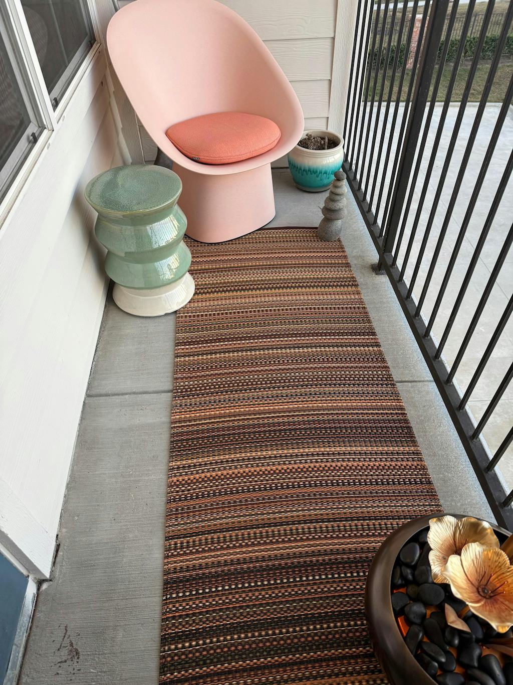 Been looking for a mat for a long time and this one is perfect for me! Has the colors I needed, fits perfectly in my space and soft on bare feet. Adding the velcro tape was a great perk! Have yet to determine how it handles the elements.