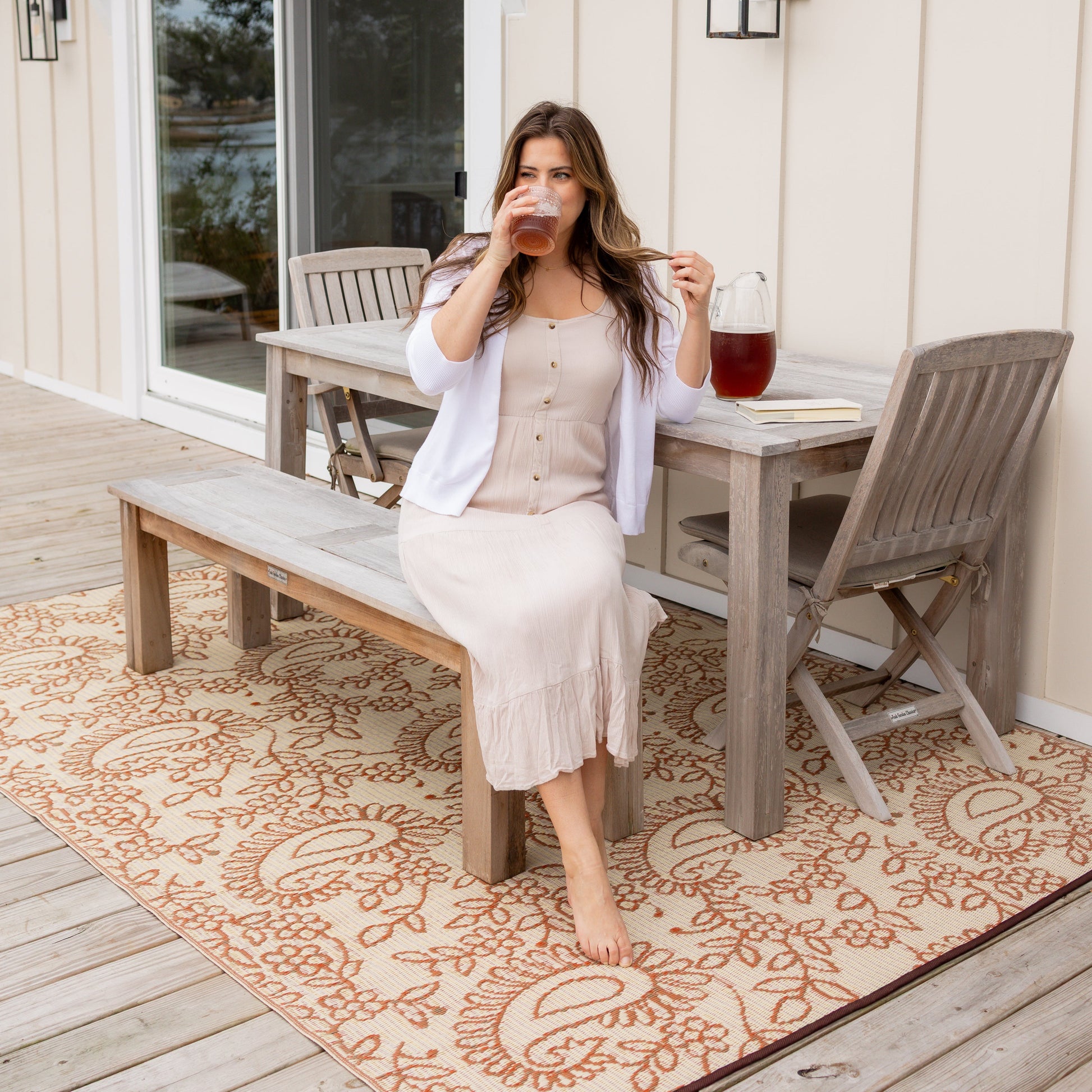 This intricate design features a flowing arrangement of classic paisley shapes intertwined with a delicate tangle of vines and blossoms. The repeating motif combines traditional elegance with a lively, organic feel, creating a pattern that feels both timeless and fresh. Ideal for adding a touch of ornamental charm to patios, porches, or garden rooms.